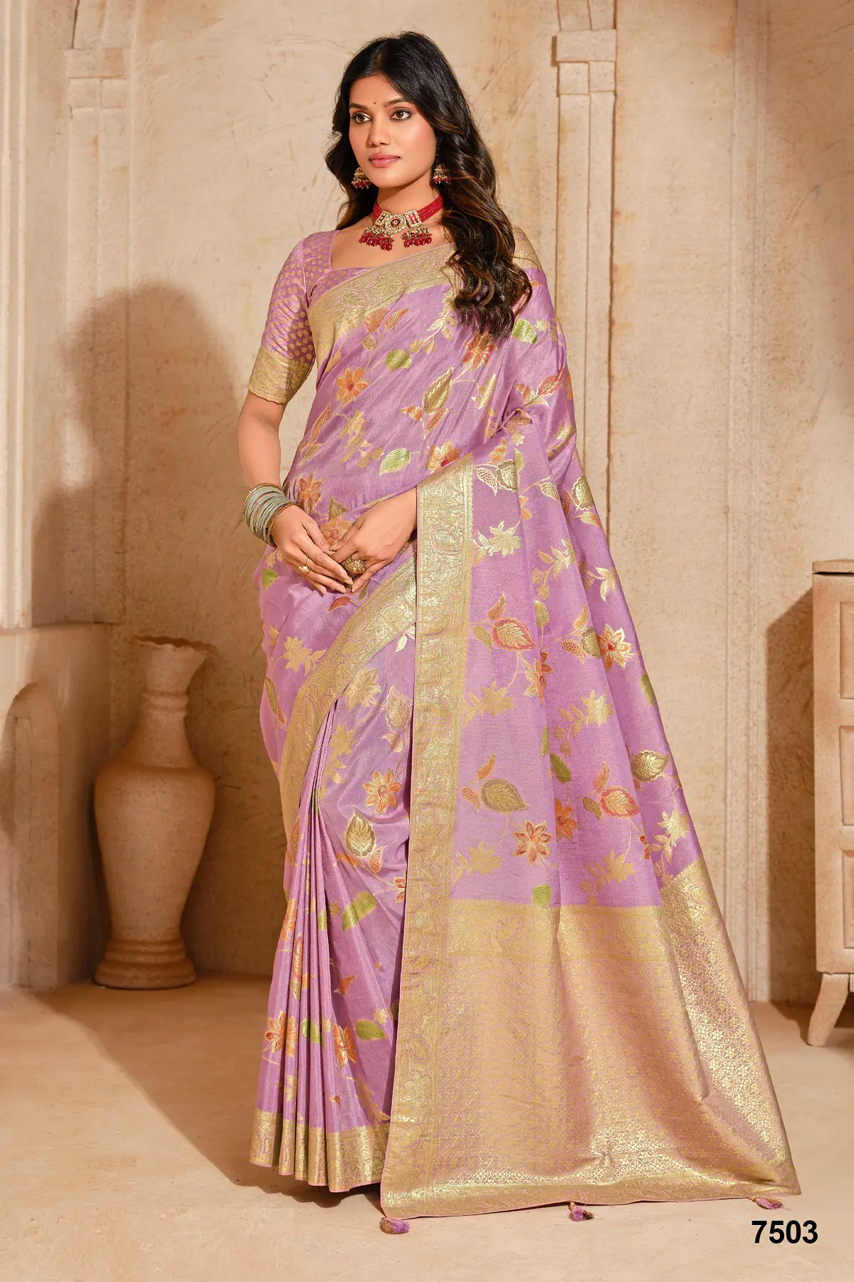 Discover timeless beauty with our Lavender Floral Saree, featuring intricate Weaving and a luxurious Zari border, perfect for weddings and festive occasions. Embrace elegance in this high-quality saree that complements your grace.