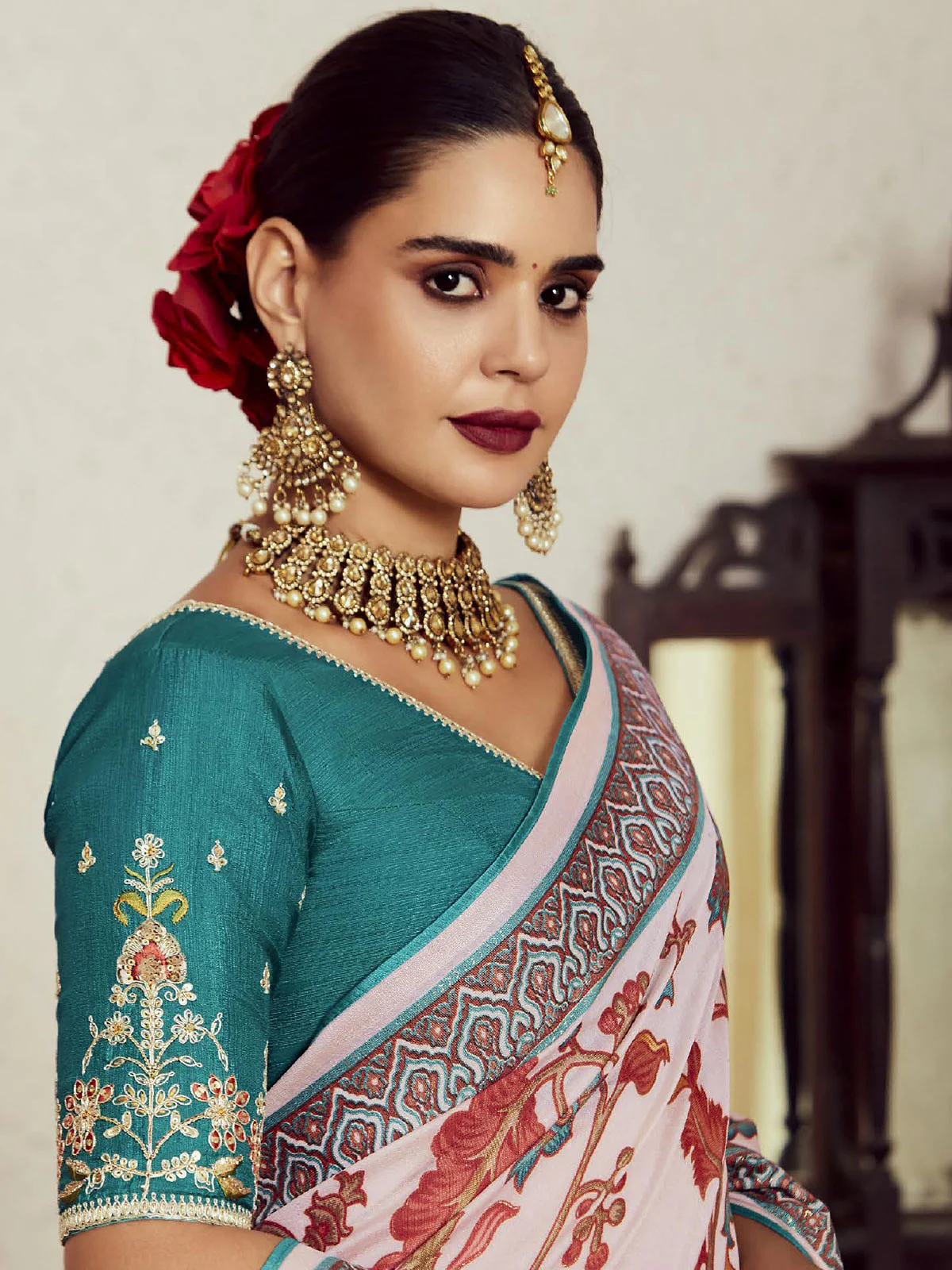 Elevate your festive wardrobe with this stunning floral print saree featuring an elegant Paithani border. Crafted from premium Brasso fabric, this saree is perfect for special occasions. The beautiful colors and intricate design make it a must-have for any fashion-forward individual looking to celebrate traditional attire with a modern twist.
